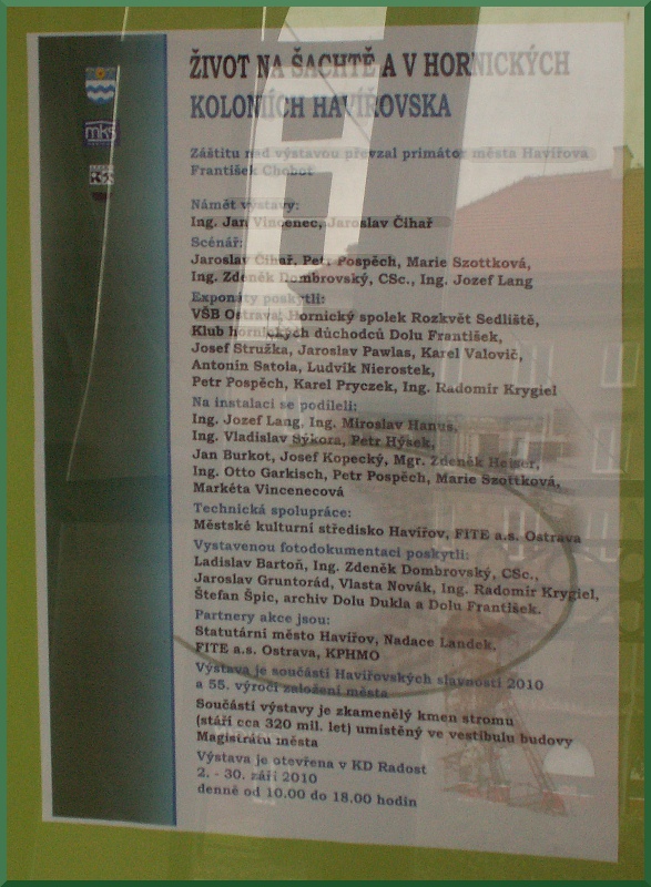 Výstava Život na šachtě a v hornických koloniích Havířovska navazuje na naši první výstavu Hornictví Havířovska, kterou jsme v roce 2008 uspořádali po vzniku místní pobočky Klubu přátel hornického muzea v Ostravě. Tehdy jsme vás seznámili se stručnou historií dolů Dukla a František, které mají přímou vazbu na naše město. Současně jsme vám představili spoustu artefaktů posbíraných před konečnou likvidací Dukly. Mnohým z vás připomněla vaše vlastní zážitky, které jste tak mohli předat dál svým potomkům a přátelům.