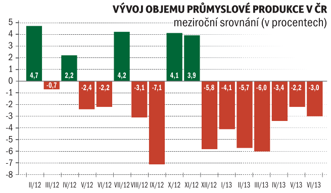 Český průmysl se v červnu podle dat statistického úřadu z pokračujícího propadu nevymanil. V červnu klesla průmyslová produkce meziročně o 5,3 procenta, při očištění podle počtu pracovních dnů o 3 procenta, v porovnání s předchozím měsícem o 0,9 procenta. Červnové povodně podle úřadu snížily produkci o 0,2 procenta.